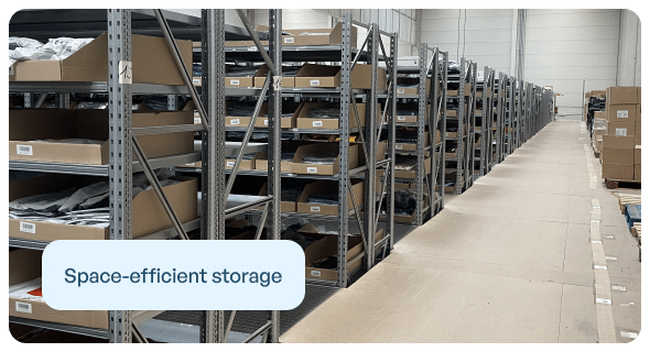 Our modern, modular shelving system allows flexible storage. By logically placing products of different sizes, we increase efficiency and reduce your costs.